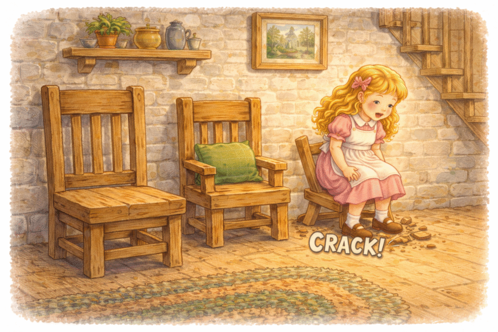 Baby bear’s chair broke as Goldilocks sat on it.